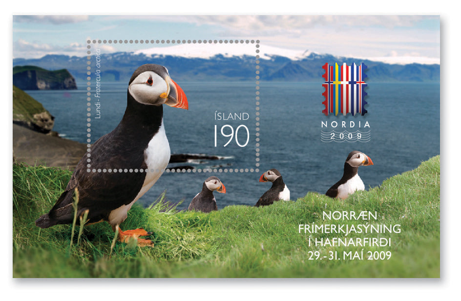 The Nordic Philatelic Exhibition Nordia 2009 will be held in Hafnarfjörður Iceland 29th-31st May 2009. The motif on the souvenir sheet which Iceland Post will issue on this occastion is the puffin. The puffin (Fratercula arctica) is a pelagic bird belonging to the Auk family. The latin term Fratercula means „little brother“ and indicates the colours of the feathers which is reminiscent of the robes of monks. The bird has also been called a “dean” or a “priest” in Icelandic. The puffin’s beak is multicolored during the mating season. The puffin is a resident bird. They lay their eggs in holes, dug into the ground, in big colonies. During winter the puffin stays at sea. The motif shows the puffin in Vestmannaeyjar island with the glacier Eyjafjallajökul in the background.