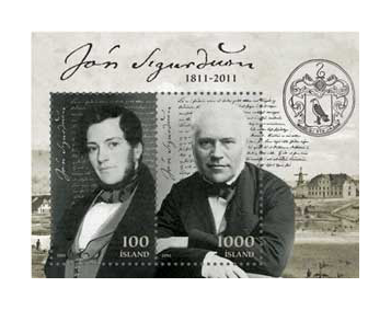 Minisheet with Jón Sigurðsson. The name of President Jón Sigurðsson is inseparably linked to the establishment of an Icelandic nation state. He started a peaceful struggle for political and economic independence in Iceland around the middle of the 19th century and excelled among his contemporaries as a national leader of the highest calibre. On the occasion of the 200th anniversary of the birth of Jón Sigurðsson on June 17th 2011 the Icelandic Parliament, Althing, recommended that the Prime Minister form a committee to prepare for the anniversary celebration. The committee proposed that Iceland Post commemorate the anniversary with a special stamp issue. Iceland Post accepted this proposal, taking into account that stamps have been issued on both the 100th and 150th anniversaries of Jón Sigurðsson. A stamp designing competion was held in cooperation with the Federation of Icelandic Graphic Designers. The winner was Borgar Hjörleifur Árnason. The selection committee found his proposal „Two Kinds of Time – Jón the younger and older” both traditional and very well conceived. Iceland Post will issue these stamps on June 17th, 2011.