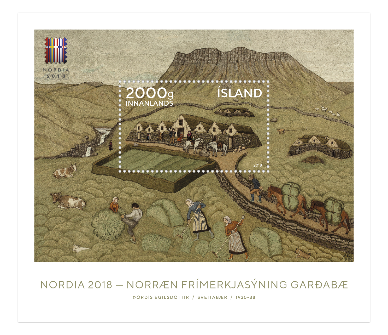 The Nordic Philatelic Exhibition NORDIA 2018 will be held in Iceland on June 8-10, 2018, in Ásgarður Sports Hall in Garðabær. The NORDIA exhibitions can be traced back to 1966 when Finland held an exhibition named Nordia. In 1975 it was decided to hold regular Nordic philatelic exhibitions. Iceland has participated in these exhibitions since 1978 and Nordia 2018 is the seventh such exhibition held in Iceland. It offers some 700 frames on all competition levels and around 20 sales booths. Iceland Post has issued a minisheet for this occasion. The motif is an embroidery by Þórdís Egilsdóttir (1878-1961) showing an Icelandic farm. Þórdís was one of Iceland‘s foremost needlework artists. Her woollen embroidery is mostly coloured with Icelandic herbal colours, based on a design by Ríkharður Jónsson made on her instructions. In 1930 Þórdís embroidered a picture of a farmer‘s living room. Both pictures were exhibited at the World Exhibition in New York in 1939. They were bought by the Icelandic state in 1944. The farmhouse tapestry graces the premises of the President of Iceland at Bessastaðir.